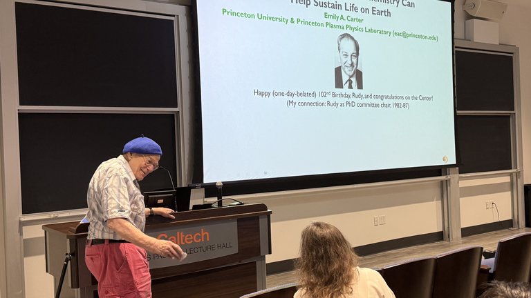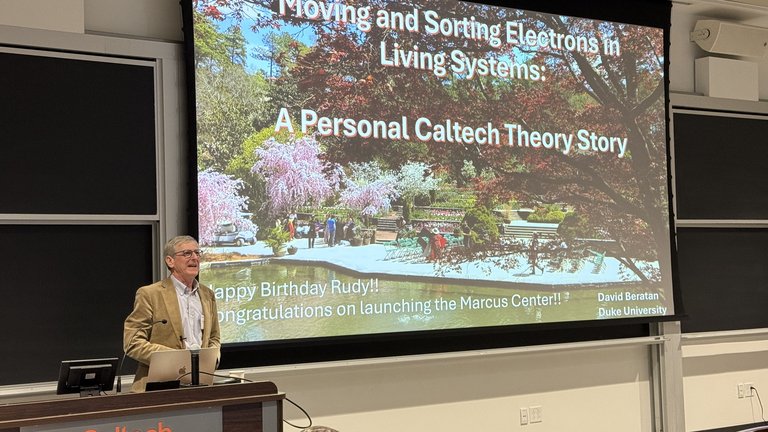 A special reception on the first day honored Professor Rudy Marcus, the Center's namesake and Nobel Laureate, in celebration of his 102nd birthday. The reception was followed by a lively poster session showcasing research by graduate students, postdoctoral fellows, faculty, and staff scientists from Caltech and other institutions.